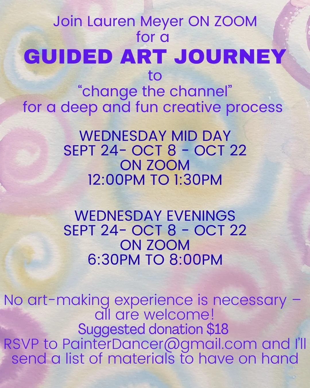"Lauren's Guided Art Journey was a revelation and a delight for me! I loved the visualizations and being guided to paint quickly and from intuition. I was surprised at what flowed out of me and feel that some real insights came through. It was so much fun and now I am eager to try painting some more! Her enthusiasm, wisdom and talent make this a wonderful experience - can't wait to do it again."